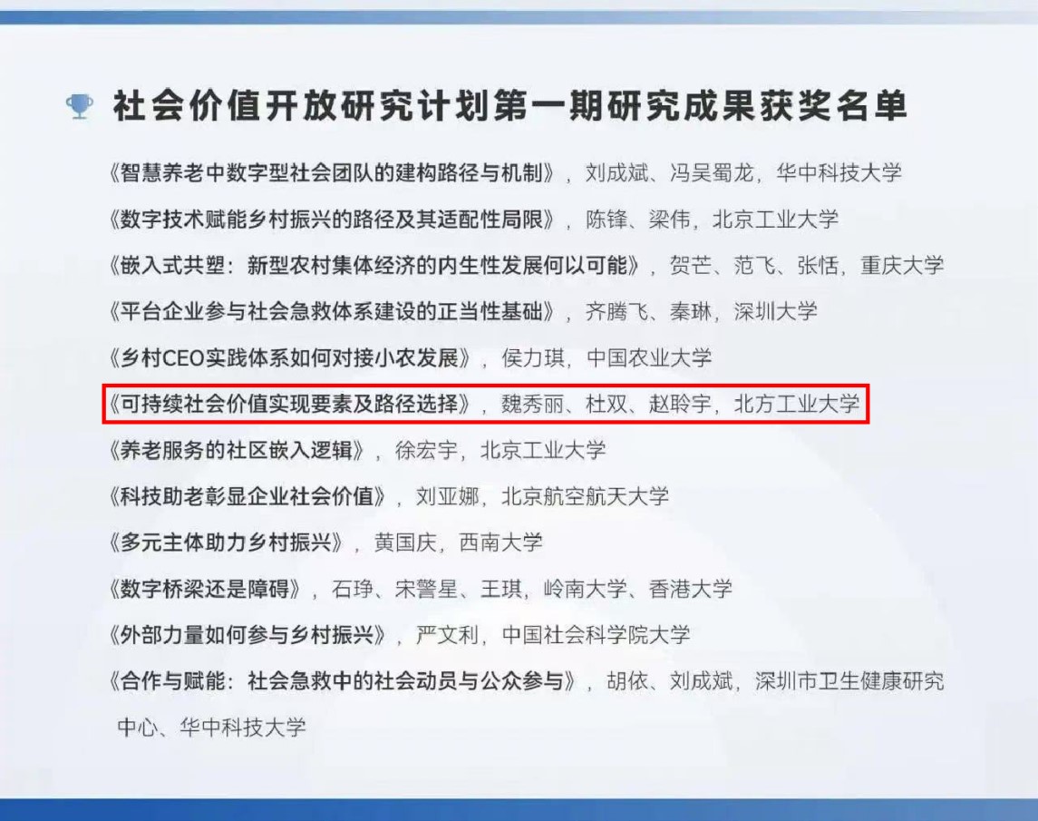此次获奖不仅是对经管学院魏秀丽副教授团队研究成果的认可,也是对pa电子官方网站在社会责任和可持续发展研究领域实力的肯定,为推动企业可持续社会价值生态的构建贡献了北方工大的智慧和力量。