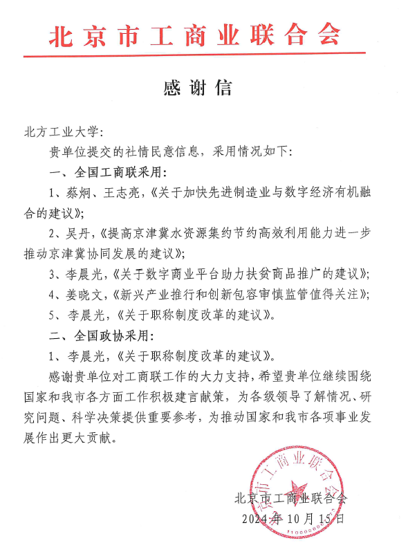 2024年10月16日,北京市工商业联合会发来感谢信,对pa电子pa电子官方网站投稿的“社情民意信息”被全国政协和全国工商联采用的情况进行通报并表示感谢。
