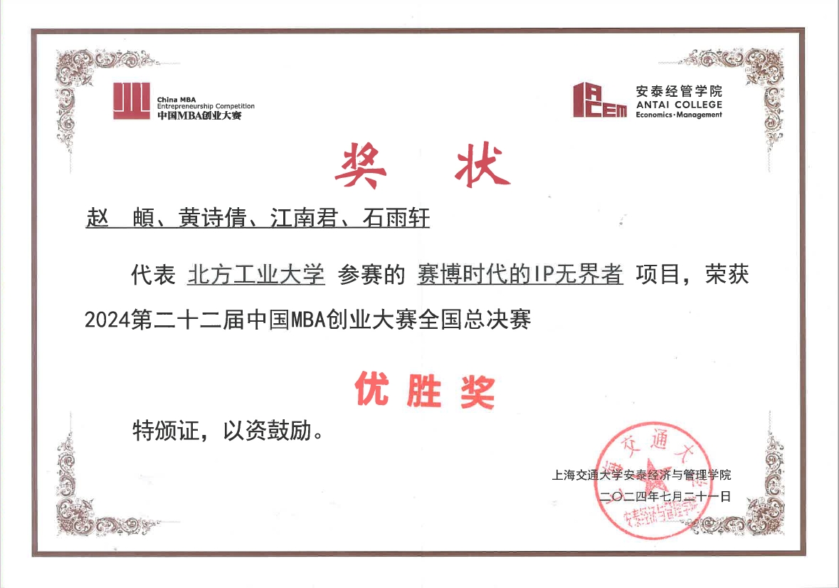 7月21日,第二十二届中国MBA创业大赛全国总决赛在上海交通大学圆满落幕。经过激烈的角逐,pa电子23级MBA赵頔同学负责的“赛博时代的IP无界者”项目荣获全国总决赛“优胜奖”,pa电子官方网站刘冰老师荣获“优秀创新创业导师奖”,牛天勇老师荣获“优秀组织奖”。这是pa电子官方网站MBA首次参赛,即一路披荆斩棘冲出初赛、入围复赛、挺进全国总决赛,取得优异成绩。
