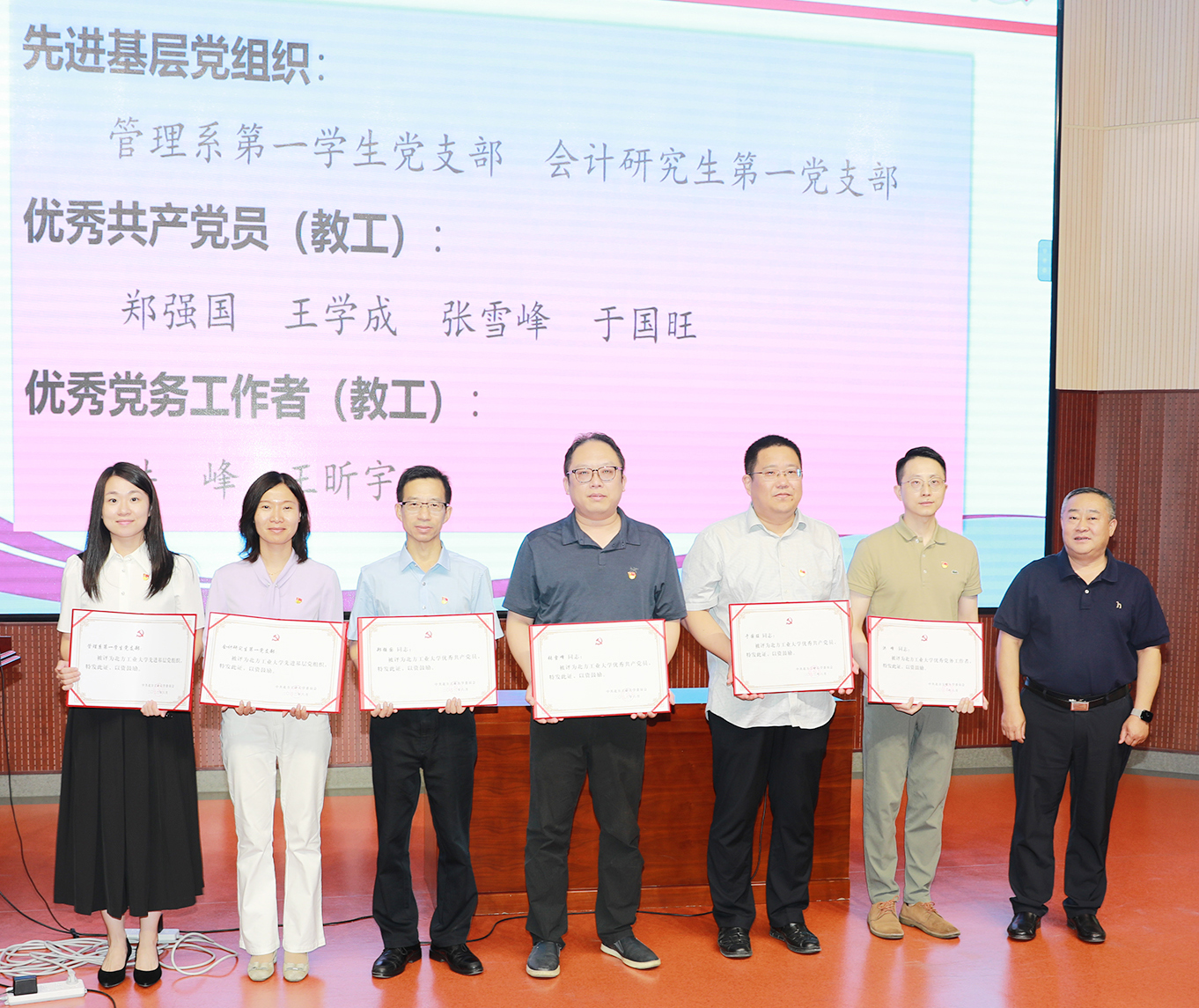 随后,学院举行了2022-2023年度“两优一先”表彰活动。党委书记王伟宾宣读《关于表彰pa电子官方网站优秀共产党员、优秀党务工作者和先进基层党组织的决定》。经学院党委研究,决定授予杨一翁等24名同志pa电子官方网站“优秀共产党员”称号,授予徐岩等17名同志pa电子官方网站“优秀党务工作者”称号,授予经济系第一学生党支部、管理研究生第一党支部等2个党支部pa电子官方网站“先进基层党组织”称号。学院领导分别为北京高校和校级优秀共产党员、优秀党务工作者、先进基层党组织进行了颁奖。