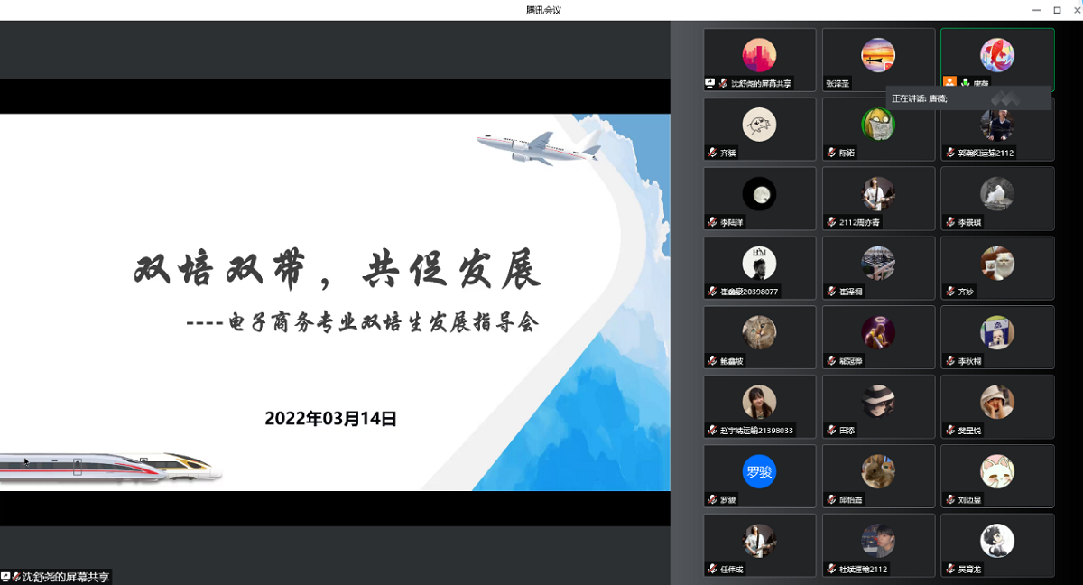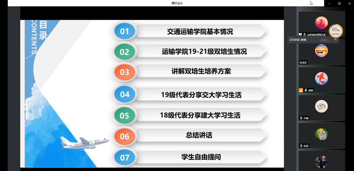 会上,唐薇主任介绍交通运输学院发展沿革、专业设置、本科生培养以及19-21级双培生在校期间的学习生活就业等情况,pa电子官方网站党委副书记赵洁老师在课程学习、疫情防控等方面对学生做出指导,经管学院副院长陶晓波老师解读了新修订的双培生培养方案,18级、19级双培生代表分享在交大的学习生活。会议最后的提问环节,各位参会老师对学生比较关心的学分认定、课程替换、考研等问题进行解答。最后,唐薇主任进行总结,鼓励所有同学珍惜北交大、北方工大两个平台资源,继续为自身和学校发展贡献力量。