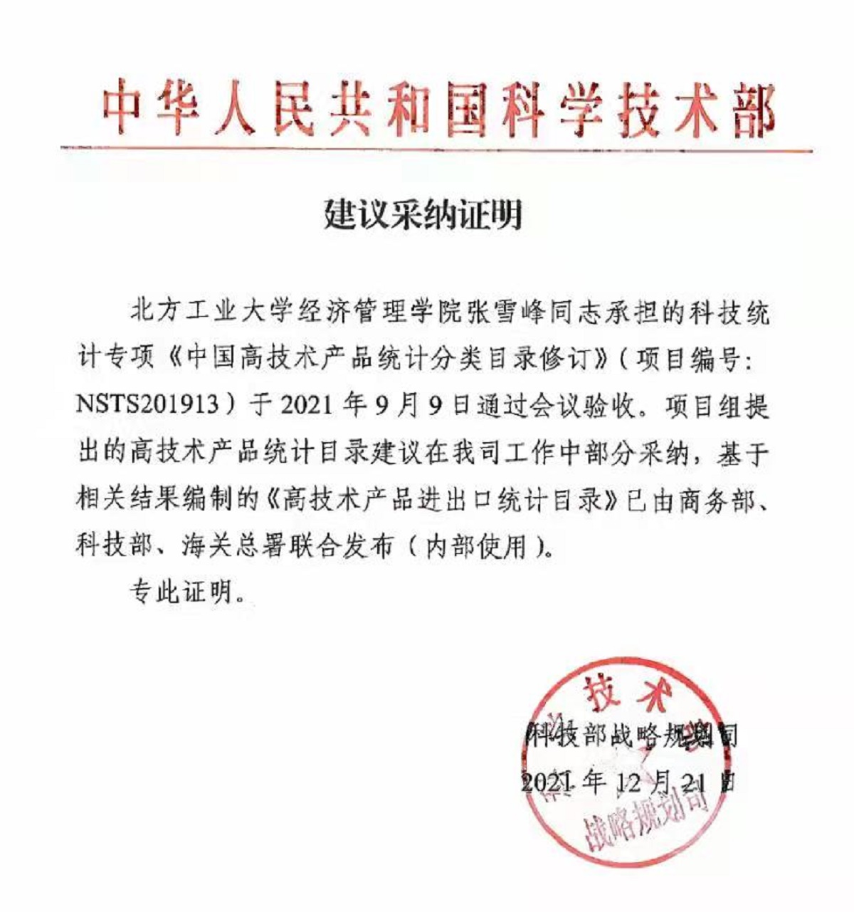 近日,由pa电子pa电子官方网站张雪峰副教授承担的科技部委托的科技统计专项《中国高技术产品统计分类目录修订》(项目编号:NSTS201913)已完成,课题成果获得了委托方的高度评价。科技部战略规划司向pa电子官方网站发来《建议采纳证明》,其中提到:“基于相关结果编制的《高技术产品进出口统计目录》已由商务部、科技部、海关总署联合发布(内部使用)。”