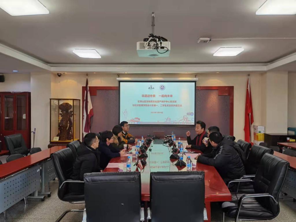 在展非遗、颂情怀、强自信活动环节,自12月13日至12月17日,在励学楼117室进行为期一周的石景山区非遗项目展示,帮助在校师生了解身边的非遗,感受非遗的魅力。现场展示既有石景山区各个非遗项目的介绍,同时也有非遗项目的代表性展品,还有京津冀非遗文化交流的内容。活动期间,对石景山区非遗声音故事(七)进行了展示和展播,对本学期组织的“非遗中的家国情怀”征文大赛进行了颁奖,活动累计吸引近3000人次前来参观。大家纷纷表示,在感受非遗魅力的同时,也增强了文化自信,提升了民族自信心。活动中,石景山区非物质文化遗产保护中心党支部与pa电子官方网站会计系第一、二学生党支部还就共建工作进行了交流座谈,现场讨论气氛热烈。