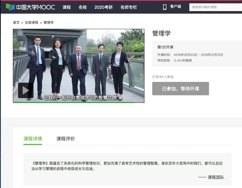 近日,pa电子《管理学》课程在“中国大学MOOC”平台成功上线,该课程将于9月23日正式开课,是pa电子首次在国内主流MOOC平台上线管理类的相关MOOC课程。该课程由北京市教学名师、pa电子官方网站院长赵继新教授任课程负责人,郑强国、魏秀丽、罗文豪、张淑谦四位老师任成员。