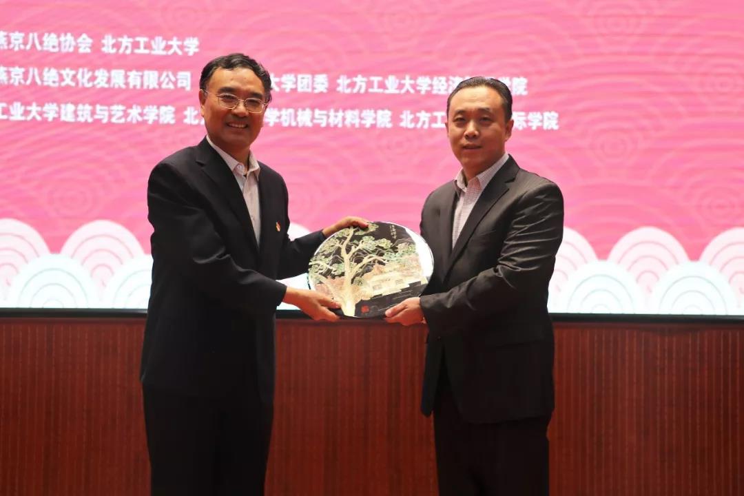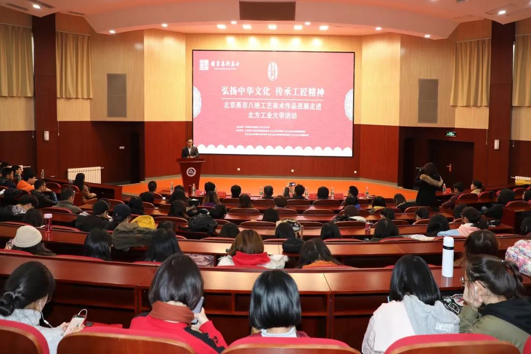 燕京八绝传承人万紫大师和北京燕京八绝协会常务副会长柏群老师分别致辞。万紫大师表示,十九大以来,在党和政府的政策指引和社会各界的积极推动下,燕京八绝事业得到了长足的发展。她希望未来所有的非遗传承人继续秉持着“敬业、精益、专注、创新”的工匠精神,努力创作具有传统工艺和北京特色的燕京八绝艺术精品。柏群副会长在致辞中表示,燕京八绝从2010年结缘西山永定河文化带,在石景山区的千年古刹承恩寺建立了燕京八绝的艺术馆。多年来,燕京八绝与北方工大都是好伙伴和好邻居,希望通过此次活动,搭建起校企合作、传承文化、传播文明的平台,为石景山区的文明创城事业、为首都四个中心建设,为中华文明的薪火相传,在各自的领域做出新的更大的贡献。