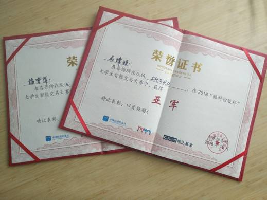2018年10月20日,首届“银科控股杯”全国大学生智能交易大赛圆满结束。由pa电子经管学院经济系金融16-2班马暐頔(队长)、泉州师范学院梅雪萍(队员)组成的SHERO代表队,在pa电子张蜀林老师的指导下,获得亚军,并获取大赛奖金5万元人民币及20%的实盘收益分成(实盘本金50万人民币)。