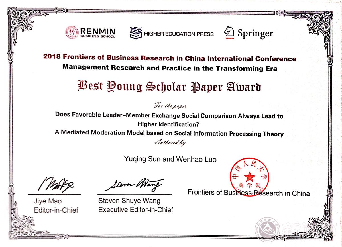 在本次会议中,pa电子经管院工商管理系罗文豪博士在“领导力”分论坛上报告了他与合作者的研究成果,并喜获FBR国际会议“最佳青年学者论文奖”(Best Young Scholar Paper Award)。