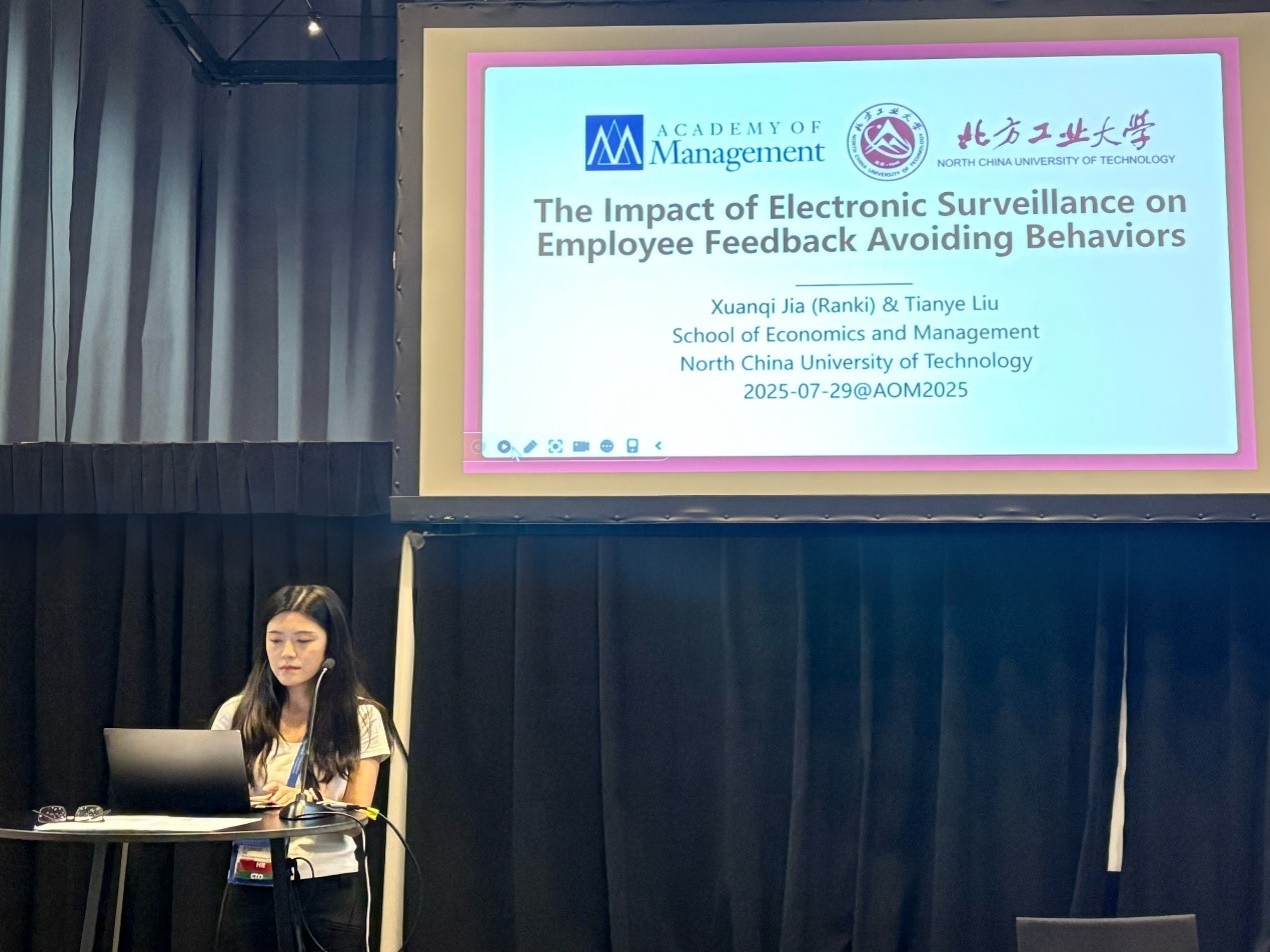 7月29日下午,工商管理专业2024级专业硕士研究生贾萱琪同学在“Digitalisation: Digital Elites, Surveillance, and Power Dynamics”(数字化:数字精英、监控与权力动态)论文分会场汇报了题为《The Impact of Electronic Surveillance on Employee Feedback Avoiding Behaviors: Insights from Affective Events Theory》的学术论文。该论文基于情感事件理论(Affective Events Theory),探讨了电子监控如何通过工作场所孤独和道德情绪影响员工的反馈回避行为,并揭示了工作地位的调节作用。该研究不仅丰富了情感事件理论在数字化监控背景下的应用,还为企业优化电子监控管理提供了具体建议。该分会场吸引了来自美国、法国、印度等多国学者,围绕数字化环境下的组织权力与员工行为展开深入讨论。贾萱琪同学的汇报获得与会者的积极反馈,展现了pa电子研究生在管理学前沿领域的科研能力。