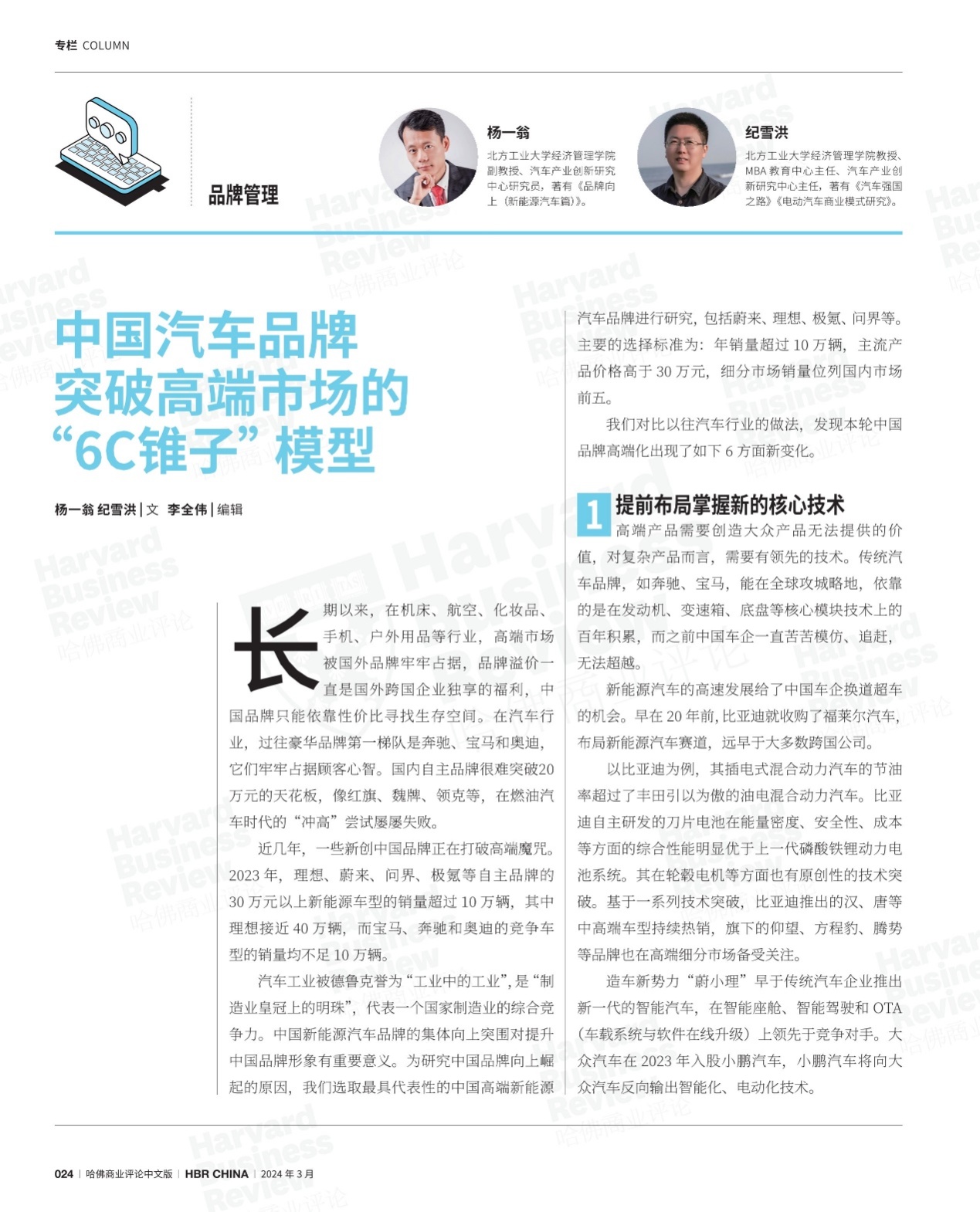 近日,pa电子官方网站杨一翁副教授与纪雪洪教授合作撰写的文章——“中国汽车品牌突破高端市场的‘6C锥子︐模型”发表在被誉为“管理圣经”的《哈佛商业评论》(中文版)杂志上。