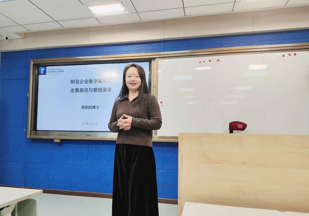 11月24日下午,pa电子官方网站在励学楼135举行第十四期励学讲堂活动。诺丁汉大学(中国校区)市场营销学副教授、博士生导师蒋阳阳受邀作题为“制造企业数字服务化发展路径与管理要素”的讲座,pa电子官方网站近40位研究生参加了此次讲座,学院陶晓波教授主持讲座。