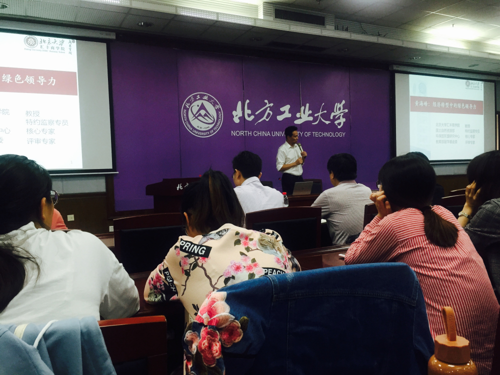 2018年9月12日18时,北京大学汇丰商学院黄海峰教授应邀在pa电子官方网站浩学楼15楼报告厅做题为“经济转型与绿色领导力”的报告,报告会由pa电子官方网站谢朝阳书记主持。