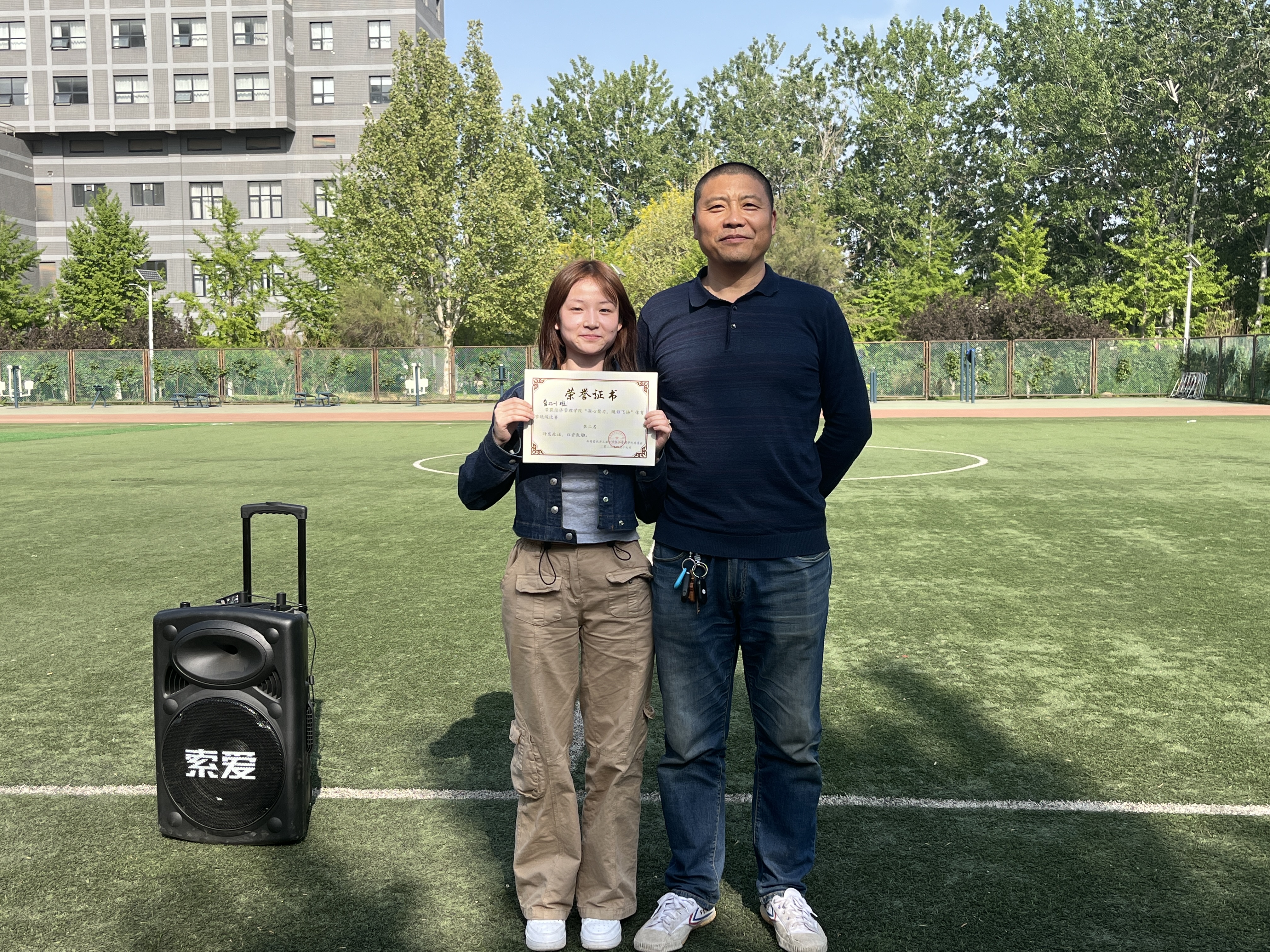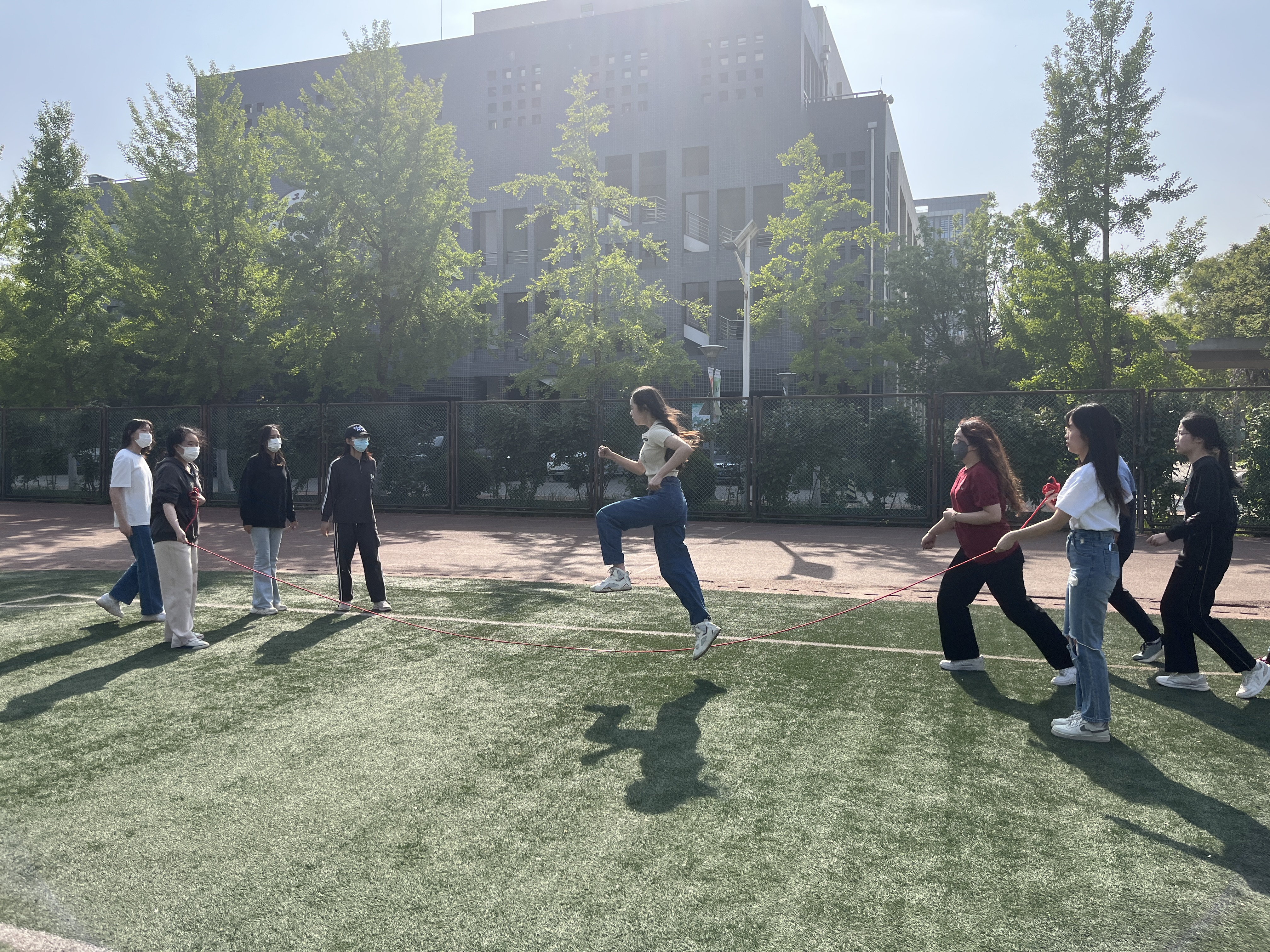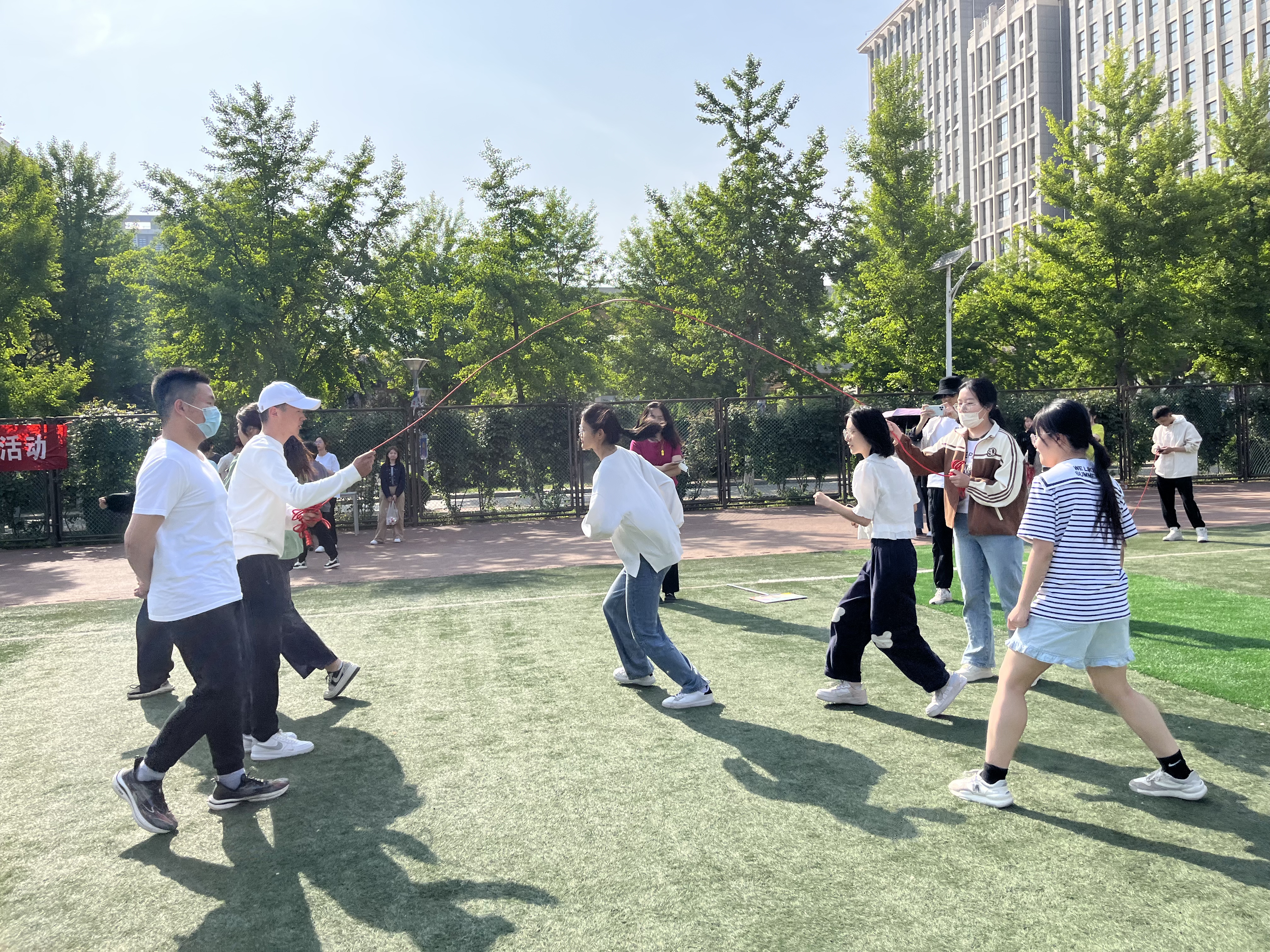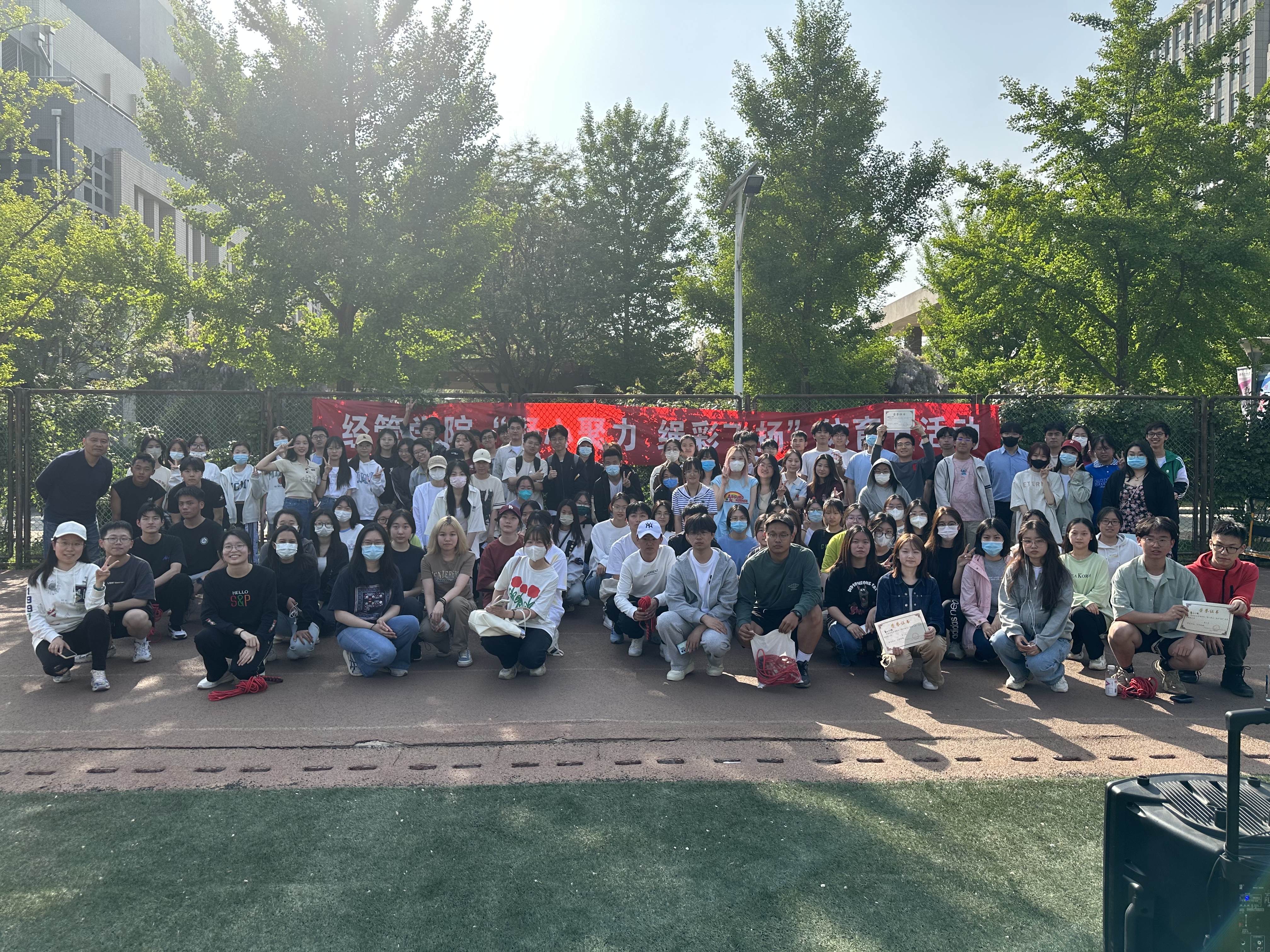 比赛开始,小操场上一派热火朝天。每个班一支队伍,由2名摇绳同学和10名跳绳同学组成。大家斗志昂扬、精神抖擞,在哨声吹响后,同学们纷纷大展身手,在长绳的一起一落中展示了自己矫健的身姿。最终,金融22-2班、管22-1班、管22-2班获得前三名的好成绩,辅导员赵灯兵为获奖班级颁发奖状。