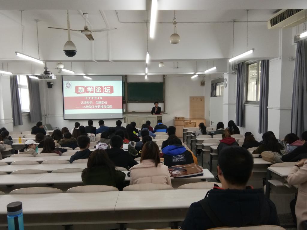 2018年3月19日和3月21日,pa电子官方网站在励学楼324教室分专业召开了励学论坛,主题为“认清形势、合理定位——面向15级考研学子谈报考”。学院党委副书记赵洁、15级辅导员马骆茹和15级全体考研学生一同参加了此次论坛。