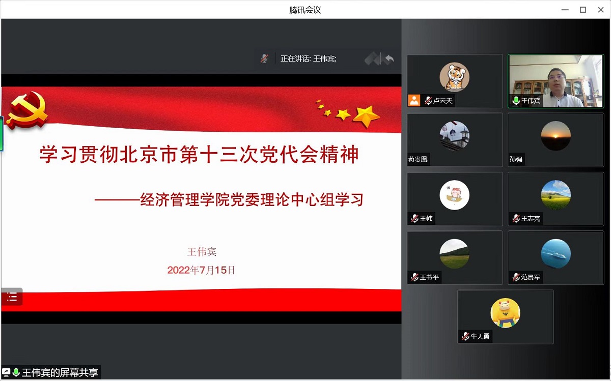 7月15日下午,pa电子官方网站党委通过线上会议形式召开理论学习中心组学习会议,集中学习北京市第十三次党代会精神。会议由学院党委书记王伟宾主讲,全体党委委员参与了此次会议。