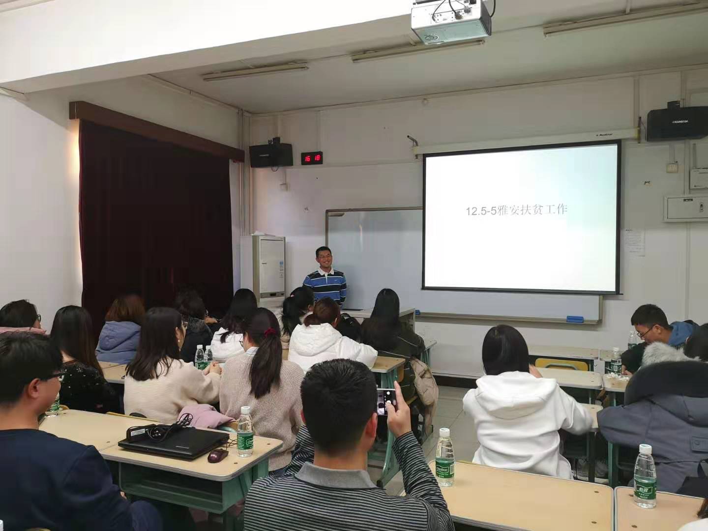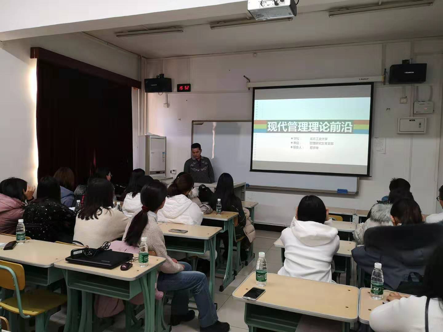 随后,管理研究生党支部党员郑宇琦同志介绍了在研究生期间学过的特色课程《现代管理理论前沿》,并分享了其中两个有趣的主题——结构洞与战略品牌管理。在场的党员同志们无不被他的讲述所吸引,并表示期待这样的课程。